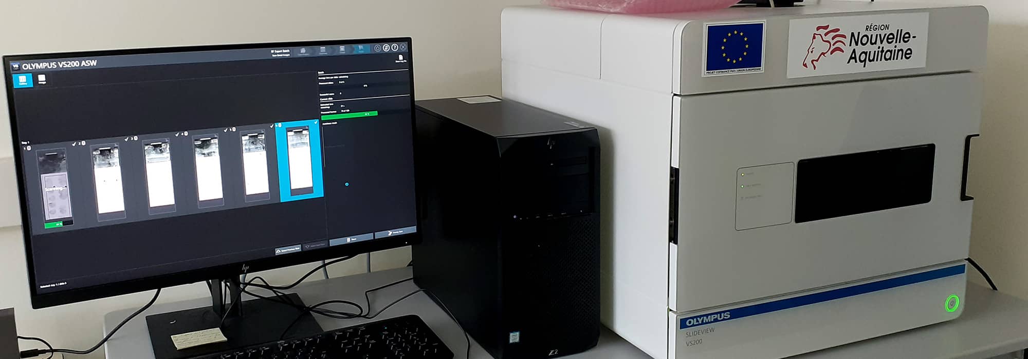 - Scanner de lames VS200 (Evident, Olympus) avec caméra couleur et caméra Orca Flash 4 (Hamamatsu) pour les échantillons colorés ou fluorescents, objectifs super-apochromatiques et support de 6 lames pour l’acquisition de type « lame virtuelle » automatisée et rapide,