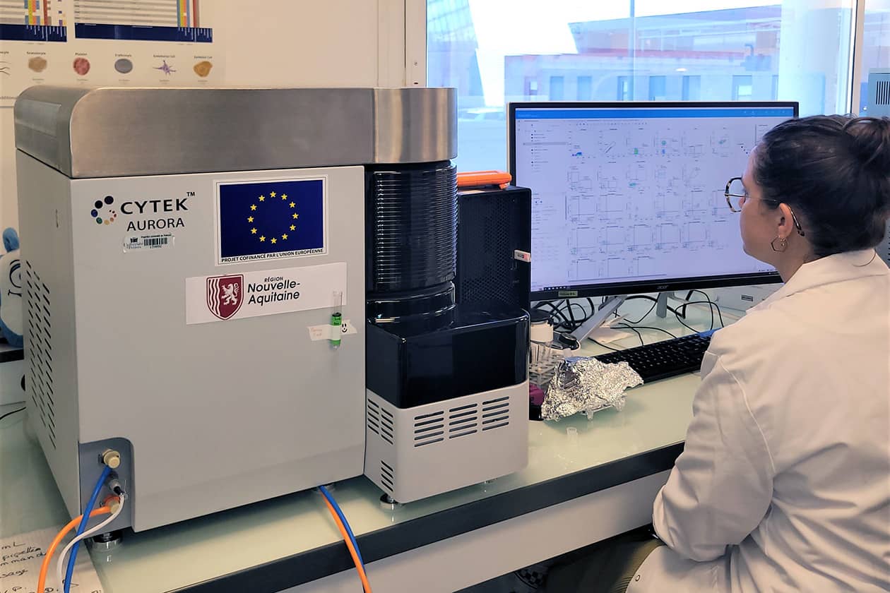 - Analyseur spectral Aurora (Cytek) avec 5 lasers non colinéaires (355, 405, 488, 561 et 640 nm), 64 détecteurs de fluorescence et passeur de plaques automatique,