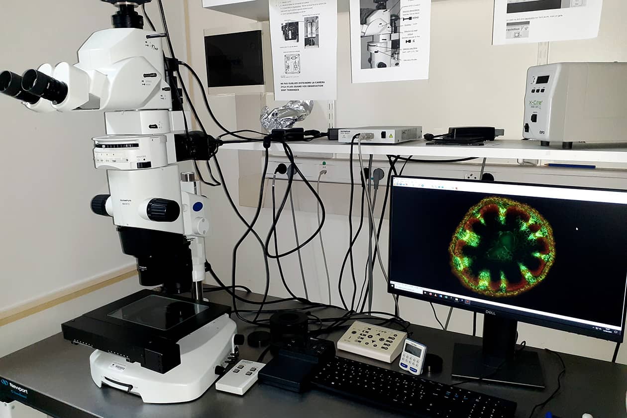 - Macroscope MVX10 (Evident, Olympus) pour l’observation de grands champs en couleur et fluorescence,